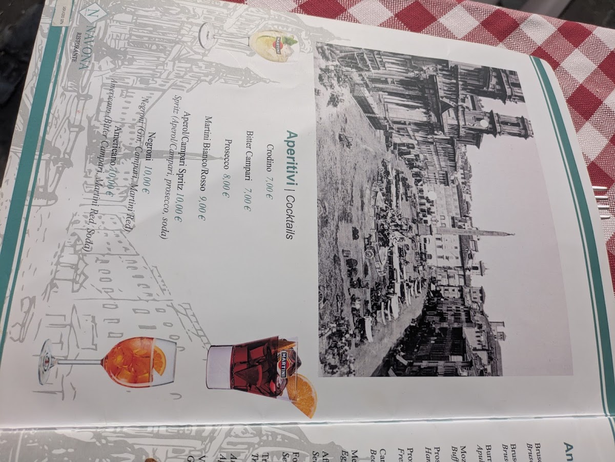 “ We came here during happy hour and had three cocktails. We ordered two pizzas for 3 people and it was more than enough food. The staff were friendly. It was right by the Piazza Navona. It is summer and they had fans that have water mist. ”